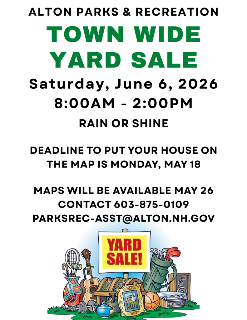 or parksrec-asst@alton.nh.gov before May 18, 2026 with your Yard Sale address location.